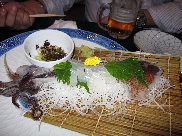 でも、でも、次々に出てくる鮮魚達は、玄界灘でさっきまで暴れまわっていた活きのいいピッチピチのヤツばっかし。この「活イカ刺」は博多名物らしく、あちこちのお店が売りにして看板を出していましたが、こだわりのジモッチーが選んでくださった所だけあって、味は抜群。ねっとり甘く舌にからみつく透き通る白いイカの身は、もはやエロスさえ感じてしまいました。