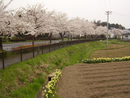 写真は平泉の中尊寺の近くの桜並木。まさに雨が降り出す直前の写真です。畑のあぜには水仙が列になって、やっと春が来た東北の人たちの喜びが表れているようでした。