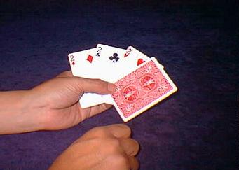 出したカードを次の順番で左手に乗せていきます。ダイヤ・クラブ ハート・スペード、そしてスペードだけ裏返して持ちます。